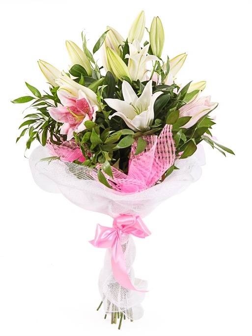 Букет из лилий, дополненный зеленью позволяет без слов выразить свою любовь, признательность, восхищение. При этом, такой подарок будет актуален к любому событию: юбилею, 8-Марта, дню рождения, помолвке и т.д. Такие восхитительные цветы способны принести в дом лишь радость, счастье, успех, ощущение праздника.